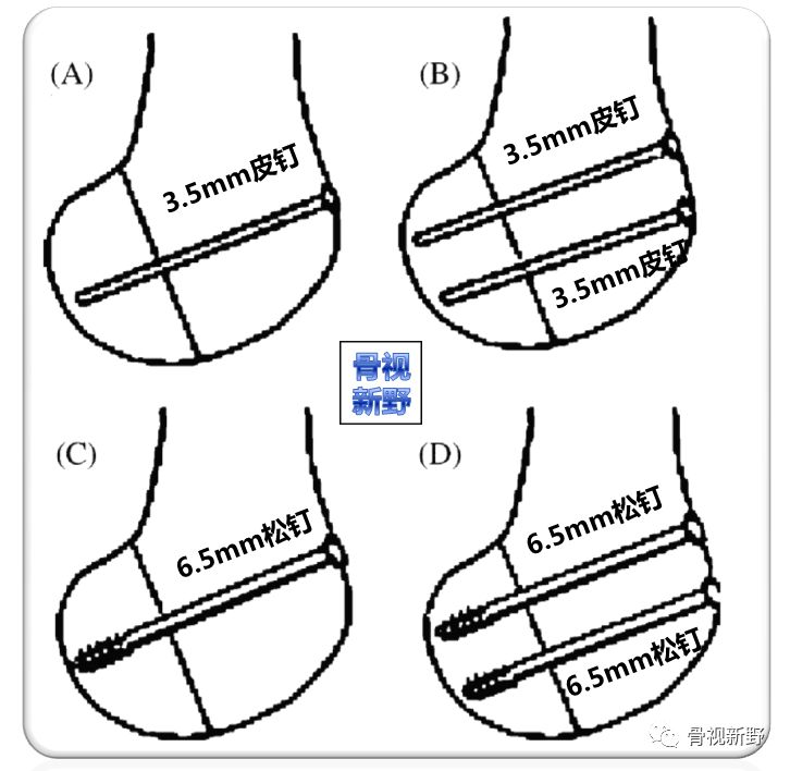 - Jarit GJ(2006)建议关节内骨折用小直径(3.5mm)的皮钉代替大直径的松钉。