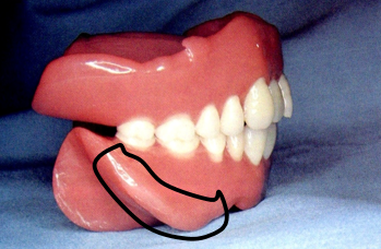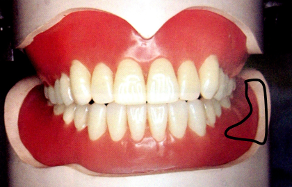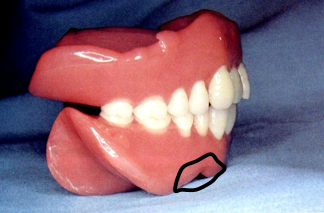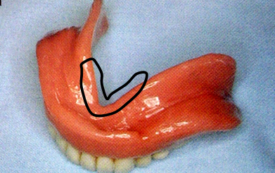 与此区相应的义齿舌侧基托边缘不应过长,否则舌运动时易将下颌全口义齿推起。