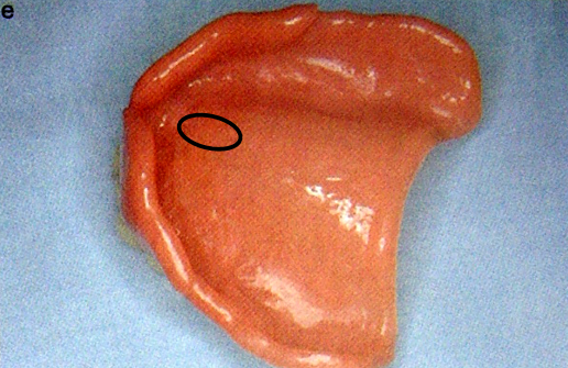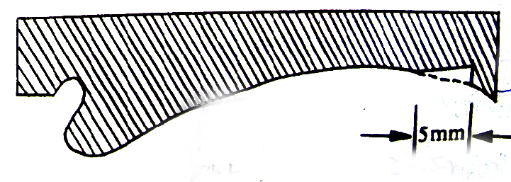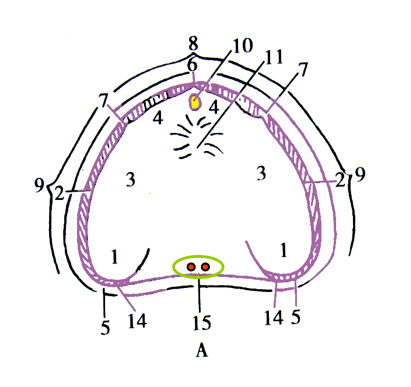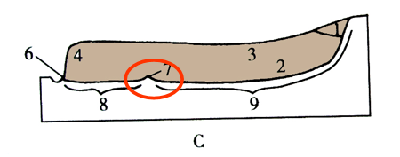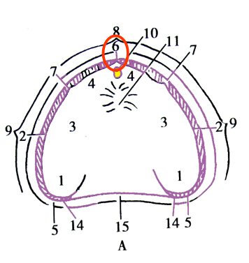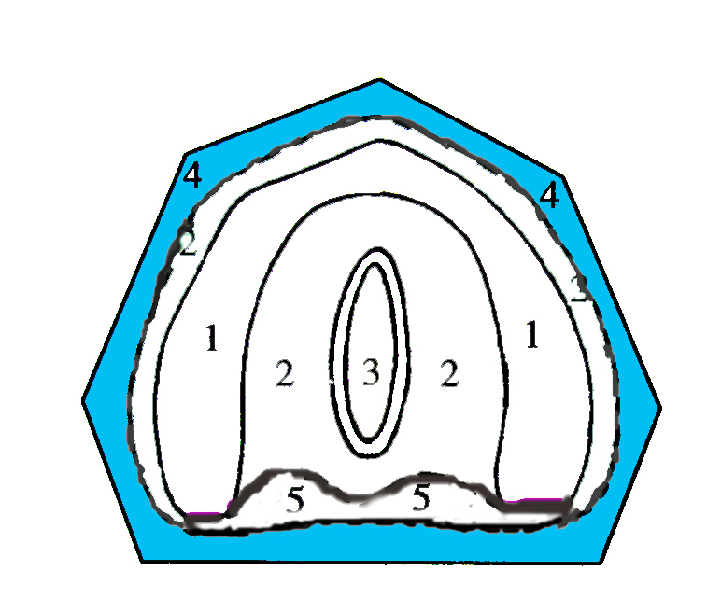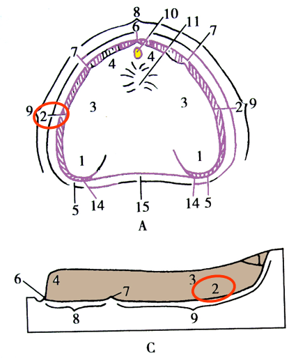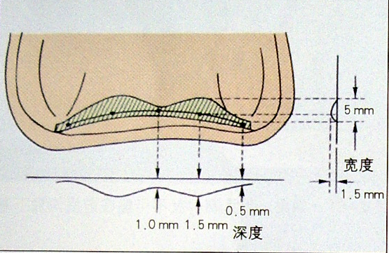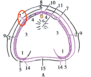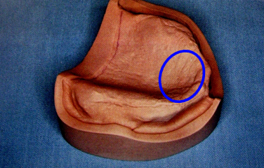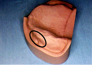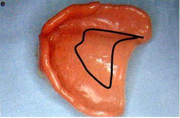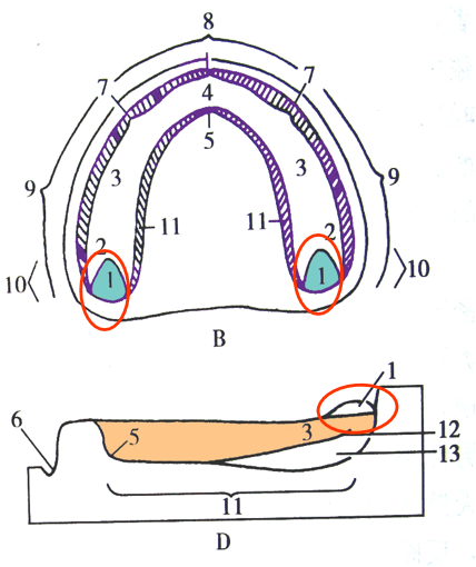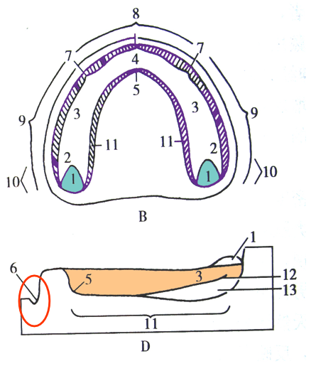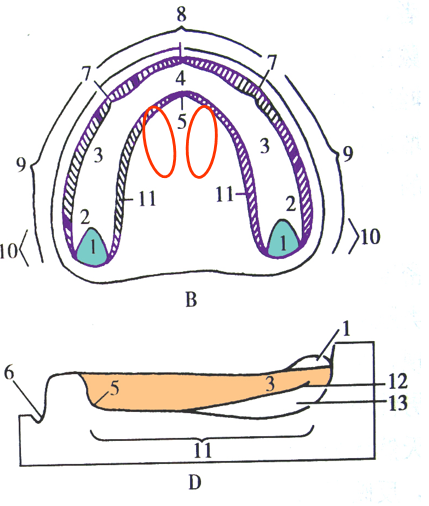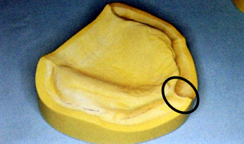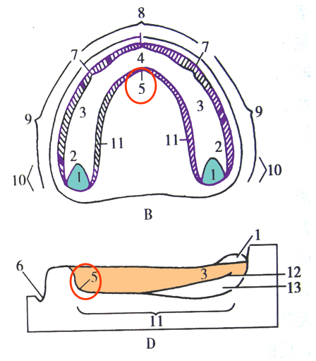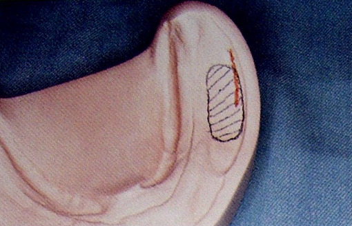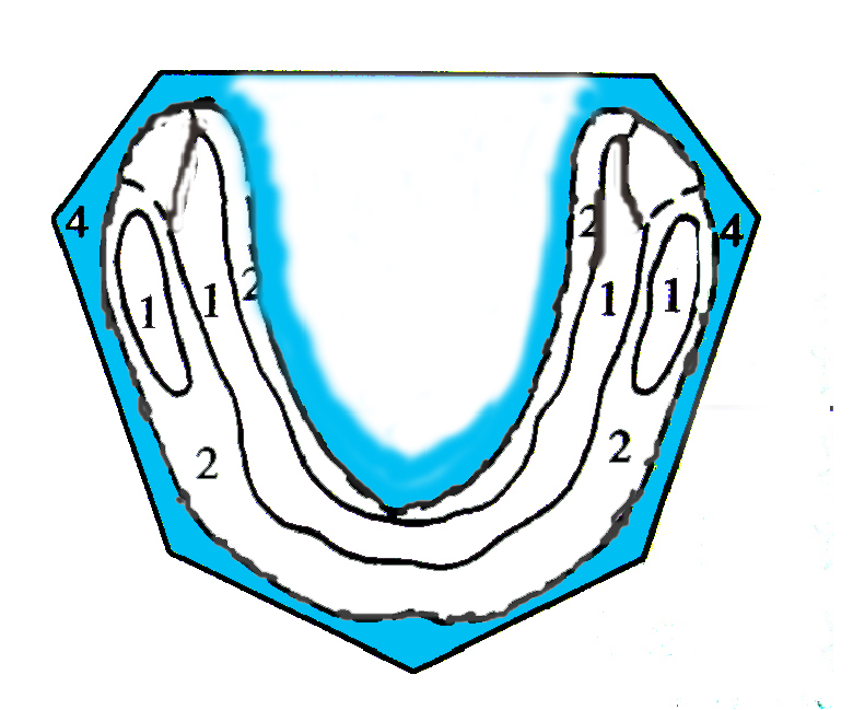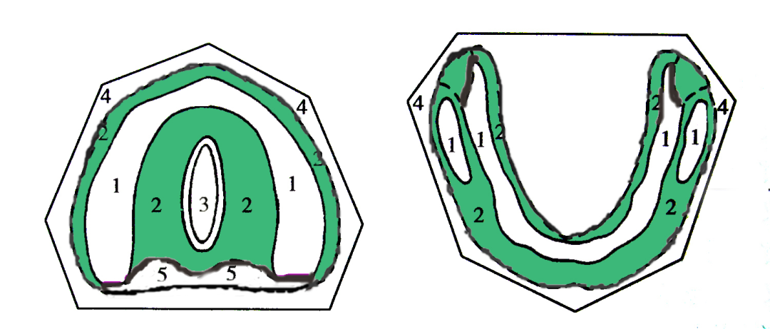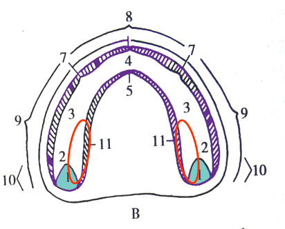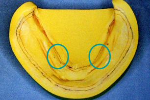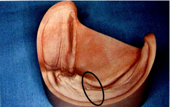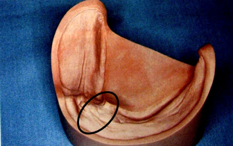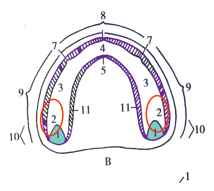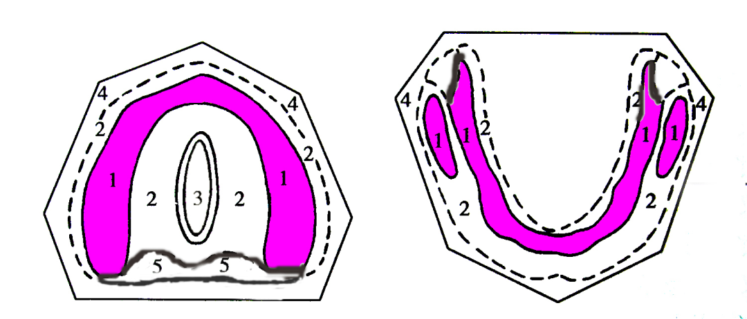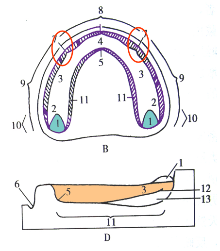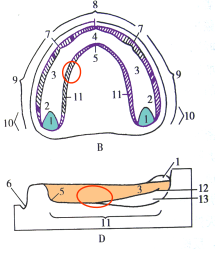 ④缓冲区:无牙颌上的颧突、上颌结节的颊侧、切牙乳突、下颌隆突、颌舌骨嵴,牙槽嵴上的骨尖、骨棱等部位。这些部位粘膜较薄,基托相应部位应磨除少许做缓冲处理。