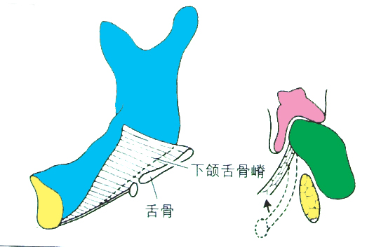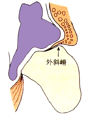 是下颌舌骨肌在下颌骨的附着处,肌纤维向前向下止于舌骨,起降下颌和拉舌骨向前的作用。即使最大程度收缩时,也允许义齿边缘延长超过下颌舌骨嵴。