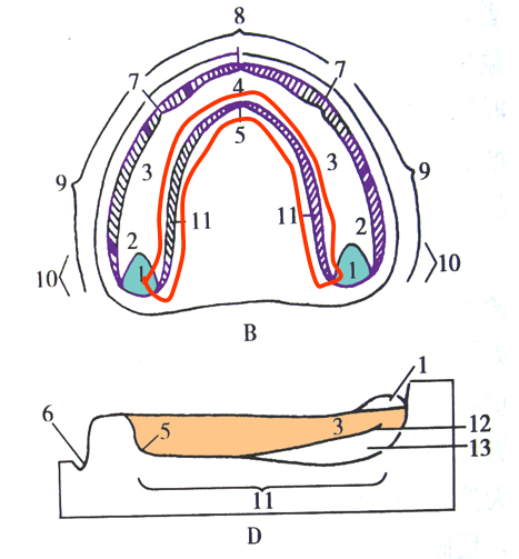 ③边缘封闭区:义齿边缘接触的软组织部分,如黏膜皱襞、系带附着部、上颌后堤区和下颌磨牙后垫。