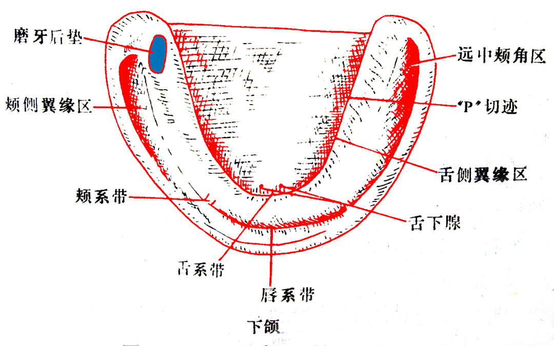 舌侧翼缘区后部是下颌全口义齿固位的重要部位,此区基托应有足够的伸展。