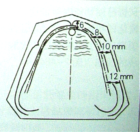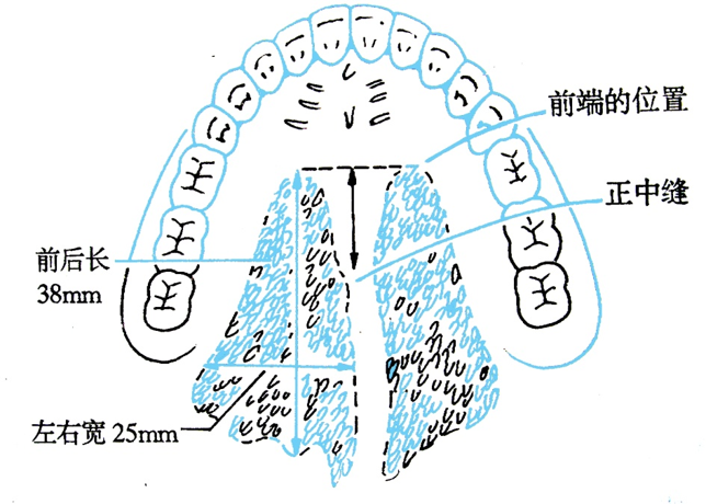 上颌全口义齿的后缘应在腭小凹后2mm处 ,颤动线位于腭小凹的稍前部。