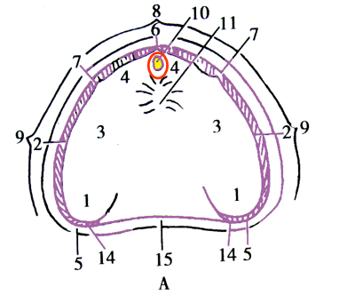 下方为切牙孔,有鼻腭神经和血管通过,故基托组织面须适当缓冲。