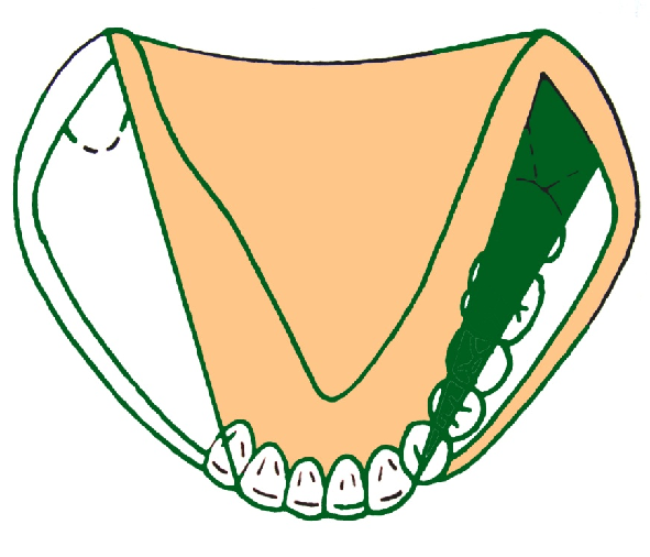 是与下颌全口义齿舌侧基托接触部位的解剖标志,从前向后包括舌系带、舌下腺、下颌舌骨肌、舌腭肌、翼内肌、咽上缩肌。