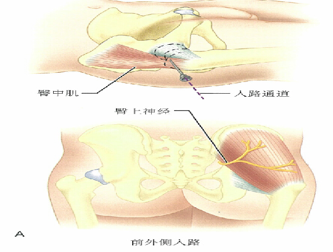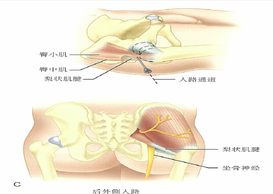 后外侧入路在后缘进入外侧关节囊之前,先要穿过臀中肌和臀小肌。它走行于梨状肌的前方和上方,该入路在关节囊水平与坐骨神经毗邻最为紧密,平均距离2.9cm,切口与臀上神经距离平均4.4cm。