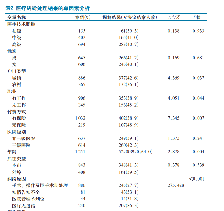 患者的人口学因素对纠纷能否解决起到一定作用。如城市的患者、没有工作的患者在医疗纠纷中更不容易协议结案,分析原因可能此人群患者平均文化水平偏高,法律意识以及维权意识较高,更重视自身权益的保护。