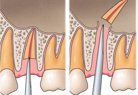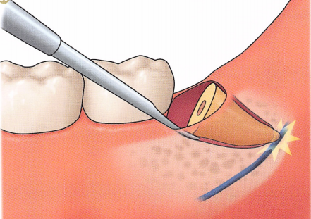 ②残根被牙龈覆盖的时候,1:用电刀切龈;2翻瓣,显露出牙周膜间隙。