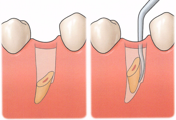 手术刀或电刀切除牙龈。去除软化的牙体,使挺子作用到硬的牙体上。