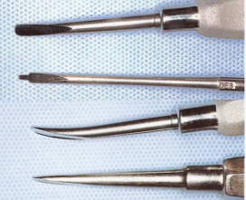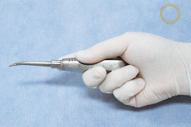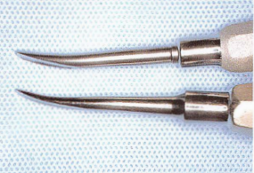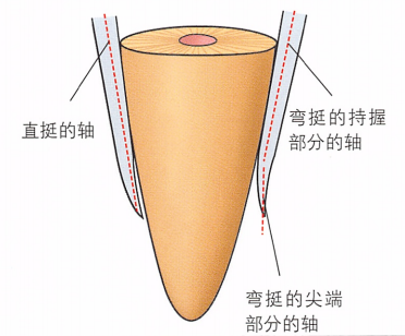 请注意弯挺尖端与握柄的角度差。弯挺是用于后牙的,所以不容易插入,挺子尖端的轴向与牙轴容易偏斜。
