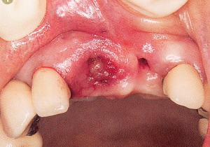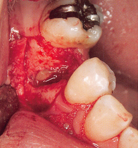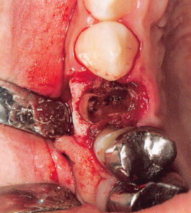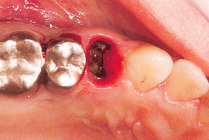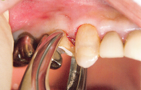 龈缘下的残根牙。任何的钳子都无法拔出,要熟练运用挺子才能拔牙。