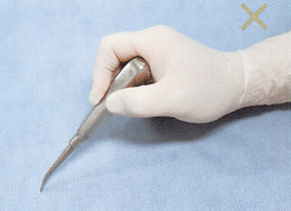 手掌将握柄的顶端包住一样握持。顶端被手掌紧紧握住不容易滑落。容易施加向下的力。有时会看到有错误的持握方法。手掌包住持握,让挺子的轴和牙根的轴一致很重要。