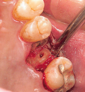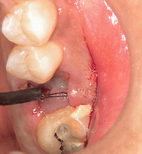 左上6的残根。残根被牙龈覆盖时,用电刀切龈,显露出牙周膜间隙后用挺子插入