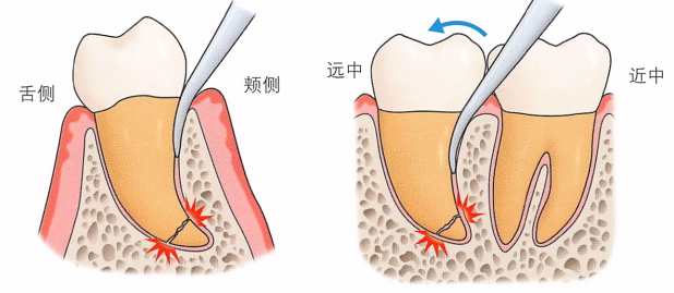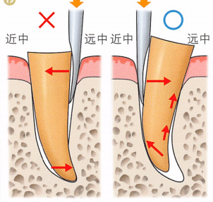 挺子的位置放反的话,牙根会断掉。⑥使用挺子时要观察牙齿的动摇、抵抗,向牙根活动大的方向使力。
