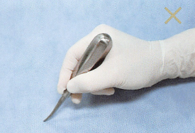 为了不使挺子滑脱损伤其他部分,另外也为了感知牙的动摇,了解挺子的效果,要以另一只手的手指扶住被拔的牙。挺子的尖端没有充分地进入牙周膜间隙,手指也不扶住牙,只在牙根侧方用力,滑脱后刺伤腭黏膜、咽黏膜、口底黏膜等而转诊的病例我们接到过。