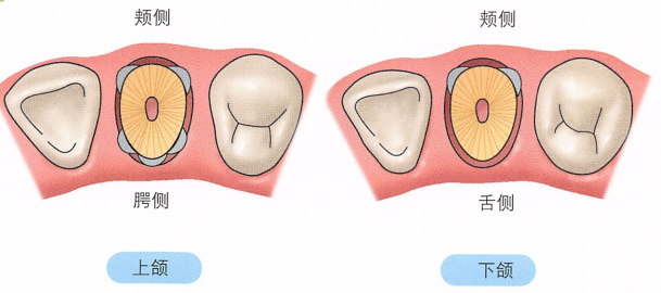 ③上颌腭侧的骨厚,如果有必要可以插入,但下颌绝对不能从舌侧插入。本来从舌侧插入就很困难,从牙体长轴、牙槽骨的倾斜来看也容易滑脱,容易造成口底损伤。