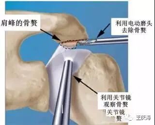 关节镜下肩峰下间隙减压术:①经后入路镜入肩峰下间隙,肩峰外侧入路入刨刀及射频,切除肩峰下滑囊,暴露肩峰下表面、喙肩韧带及肩锁关节下表面,明确肩峰内缘、前缘及外缘,检查肩袖有无撕裂;②射频切断或部分切断喙肩韧带;③肩峰外侧入路入磨钻,磨平肩峰前缘;④肩峰外侧入路入关节镜,后入路入磨钻,将已切除部与未切除部之间的嵴磨平。