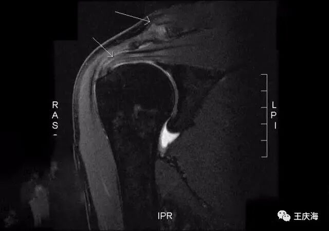 (3)MR:主要对肩袖、二头肌腱、盂唇、滑膜、软骨和肩峰下滑囊等结构进行检查。