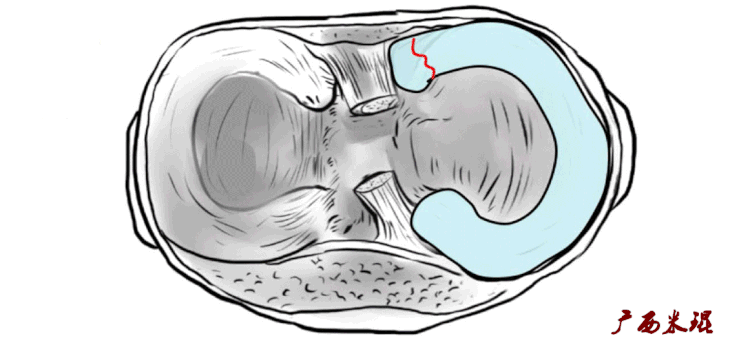 我们又回到半月板,例如半月板的放射状撕裂,其环状纤维的作用消失导致半月板自身不稳定,这是由于半月板的解剖及其生物力学因素决定的。
