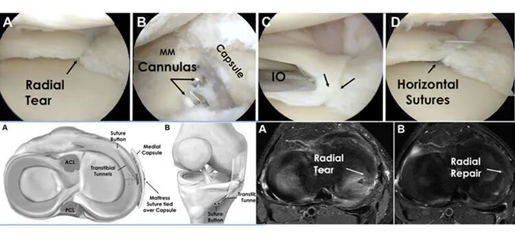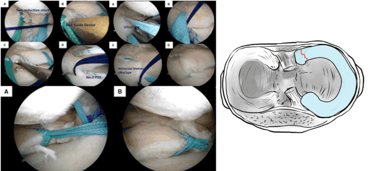 Bancha等认为单纯的后根缝合不能够完全解决半月板的外突问题,体部经骨道缝合固定可以有效的防止半月板外突,并可以减少半月板后根撕裂口的张力。