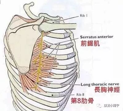 前锯肌位于胸廓的外侧皮下,上部为胸大肌和胸小肌所遮盖,起于上位 1 至 9 肋外侧面,止于肩胛骨的内侧和下角的前面。