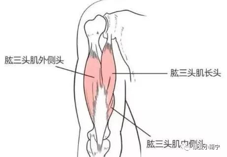 肱三头肌在上臂后面延伸,可伸直或伸展该臂,分为长头、内侧头、外侧头,一个附着在肩胛骨上,另两个附着在肱骨上。
