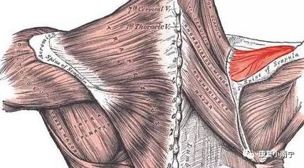冈下肌一部分被三角肌和斜方肌覆盖。起自冈下窝, 肌束向外经肩关节后面,止于肱骨大结节的中部。