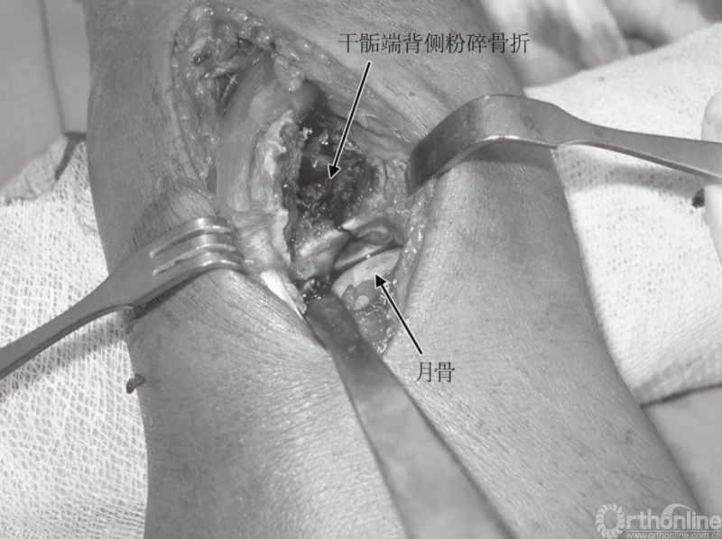 另做一切口进入第二伸肌间室,在直视下复位侧柱。从桡骨茎突上松解肱桡肌腱有助于内固定的植入,并可缓和茎突上肌肉的变形力。背侧入路显露过程中唯一有损伤风险的血管神经结构是桡神经浅支,在第二间室切开时应注意探查并保护。以月骨、舟骨为参照物,直视下复位关节面,并在尽可能的远端、软骨下骨打入1mm克氏针做临时固定。