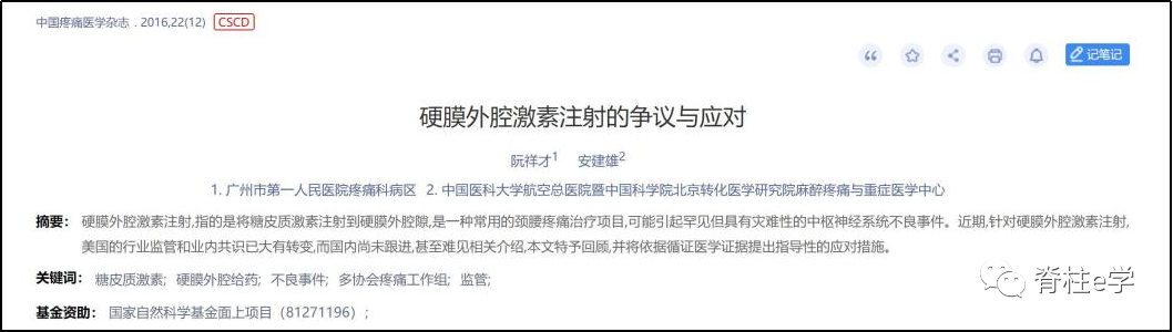 针对上述指南对于ESI的疗效的认可,特意去检索国内外数据库,发现目前对于ESI证据主要集中在有效性方面,而安全性证据极少。ESI 有效性证据倾向于支持对根性神经痛具有一定的短期疗效,而对椎管狭窄所致腰腿痛可能并无有益效果;ESI安全性证据主要包括零散的病例报道和FDA的不良事件上报系统,显示ESI具有灾难性中枢神经系统损害风险,具体文献推荐《硬膜外腔激素注射液的争议与应对》,虽时效性欠差,但观点很明确。