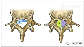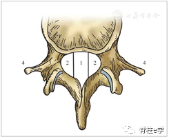 以椎体后缘为界分1~4区,两侧椎弓根内界为1、2区,中1/3为1区(中央区),左右1/3为左右侧2区(旁中央区),椎弓根内外侧之间为3区(外侧区),椎弓根外侧以外为4区(极外侧区)。