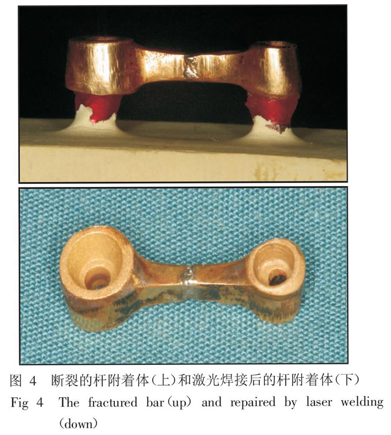 对于并发症的处理,断裂的附着体可考虑使用激光焊接技术(图4),破损严重的应重新制作,固位力下降的可以考虑更换相关组件或重衬。