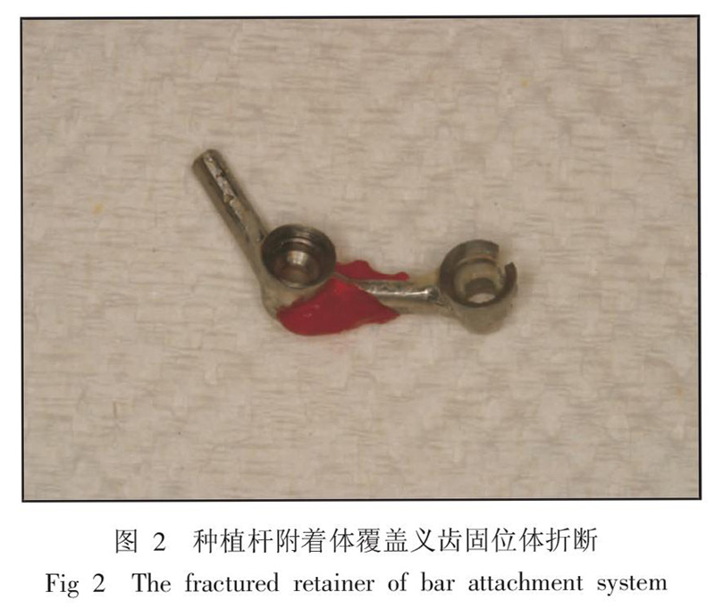 Goodacre等通过回顾文献,结果显示:种植覆盖义齿30%存在固位和调整的问题,19%需要重衬,17%会出现卡抱部分折断,12%会出现修复体折断(图1、2)。
