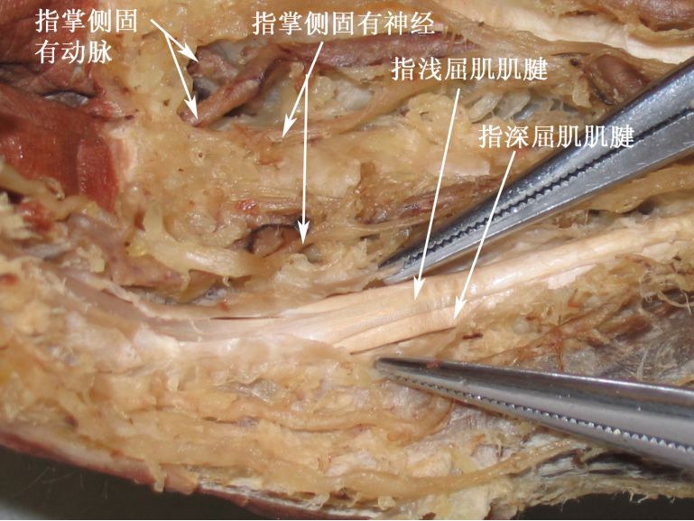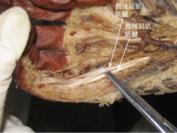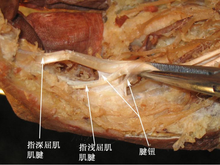 指浅屈肌腱在近节指骨处覆盖并包统指深屈肌腱,并向远侧分为两股附着于中节指骨中部的两侧缘,形成腱裂孔,容纳深腱穿过。指深屈肌腱穿胆裂孔后,止于远节指骨底。浅腱主要屈近侧指关节,深腱主要屈远侧指关节。两腱有独立的滑动范围,又互相协同增强肌力。