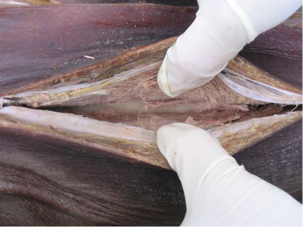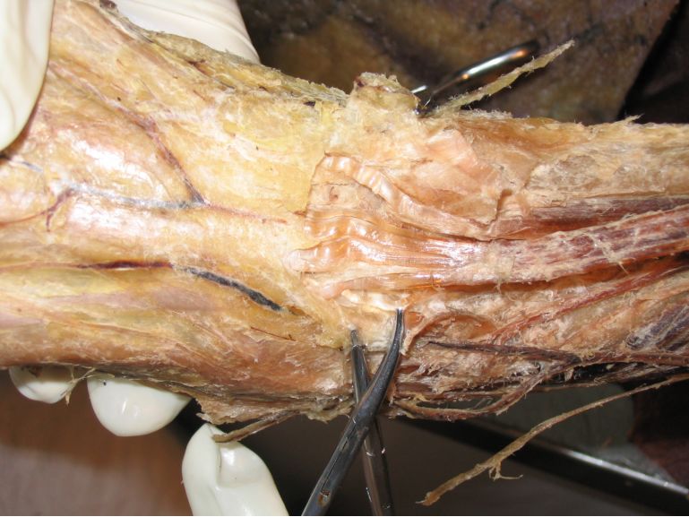 a.切开皮肤、皮下组织及深筋膜,找到肱桡及内侧缘。在切口近侧找到它和旋前圆肌的界线,在切口远侧找到它和桡侧腕屈肌的界线,沿上述间隙向远近侧分离出桡神经浅支。