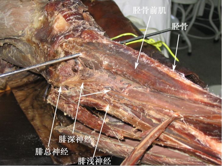 前区血管神经包括胫前动脉、胫前静脉和腓深神经。在前区上部处于胫骨前肌与趾长伸肌间,在前区下部处于胫骨前肌与长伸肌间,至小腿下端伸肌上支持带处,长伸肌腱由其浅面跨过,胫前血管神经处于、趾长伸肌腱间。