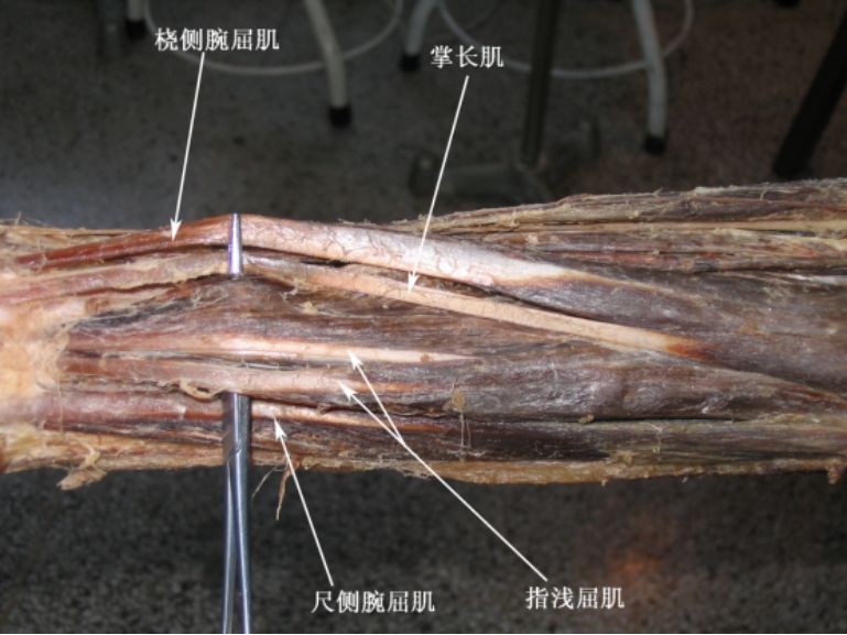 手掌的屈肌腱:桡侧腕屈肌腱,指浅屈肌腱,指深屈肌腱,拇长屈肌腱。