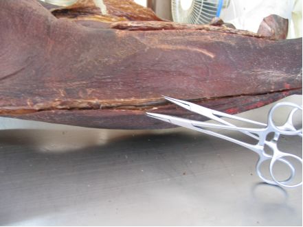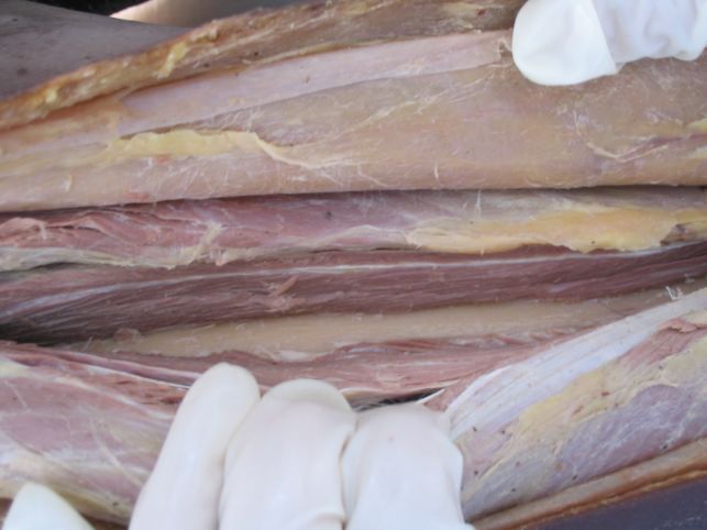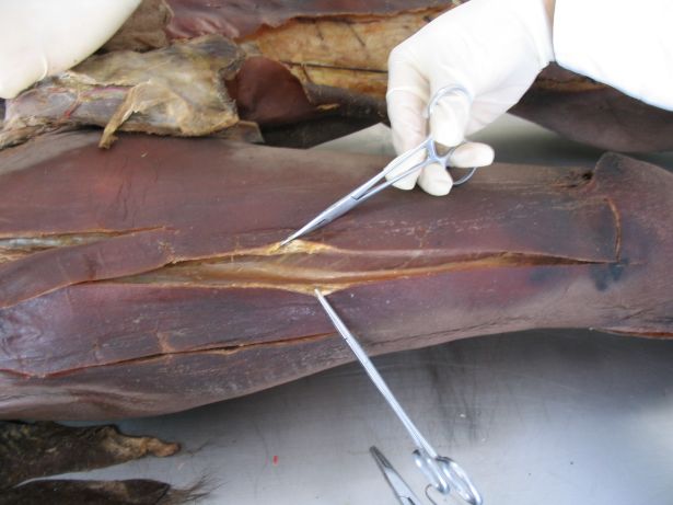 2、分离:沿皮肤切口线切开阔筋膜,辩明股直肌与股外侧肌之间的间隙,钝性分开,显露出深层的股中间肌。在股骨前方,沿股中间肌纤维方向切开,直达股骨,作骨膜下剥离。