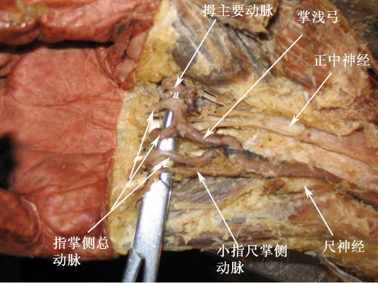 手掌的动脉: 掌浅弓位于掌腱膜深面,指屈肌腱和正中神经浅面,由尺动脉终支与桡动脉掌浅支吻合形成。它发出4个分支:1支为小指尺掌侧动脉新;3支为指掌侧总动脉,行至掌指关节附近,各分为2条指掌侧固有动脉。掌深弓位于掌骨和骨间肌的浅面,指屈肌腱与屈肌总腱鞘的深面,由桡动脉主干和尺动脉深支吻合而成,与尺神经深支伴行。它向远侧发出3条掌心动脉。