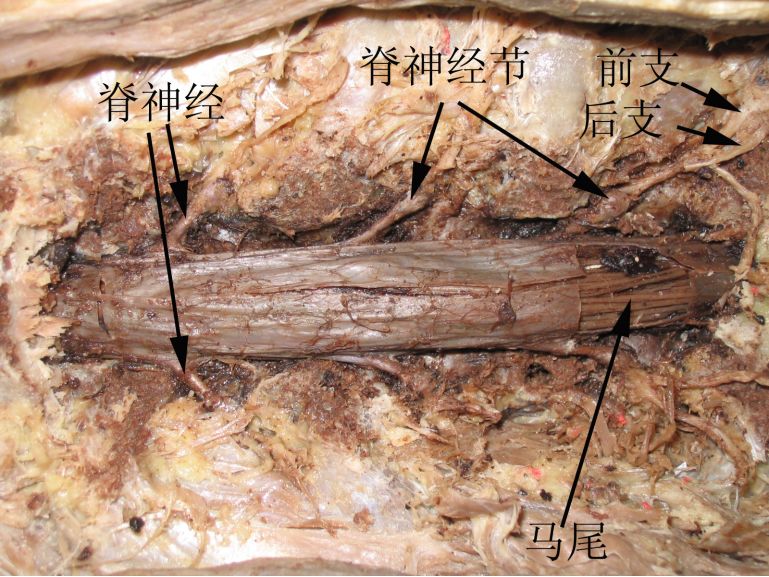 5、脊神经:1)脊神经共31对,计有颈神经8对,胸神经12对,腰神经5对,骶神经5对,尾神经1对。2)脊神经由与脊髓相连的前根和后根在椎间孔合并而成。3)脊神经节是后根在椎间孔处的膨大部,为感觉性神经节,主要由假单极神经元胞体组成。4)脊神经出椎间孔后立即分为前支和后支。