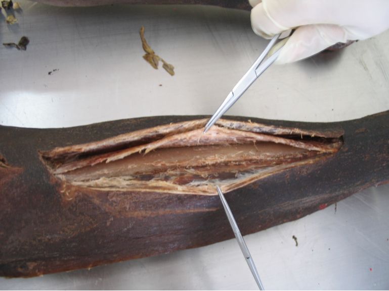 3、分离:沿皮肤切口切开深筋膜。沿尺骨皮下缘从腱膜上切开起始于此的尺侧腕伸肌纤维,并从尺骨上剥下腱膜。在鹰嘴部,沿肘后肌平面切开尺侧腕屈肌。 然后沿尺骨纵轴切开骨膜,作骨膜下剥离。