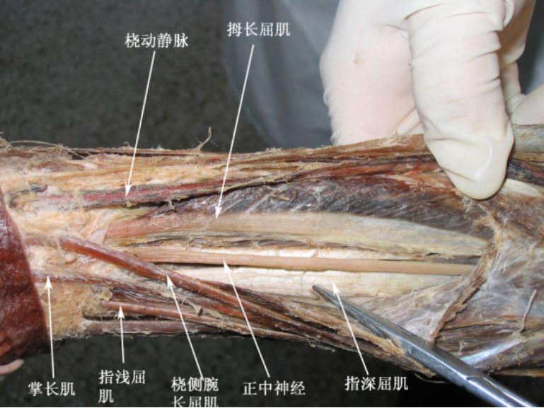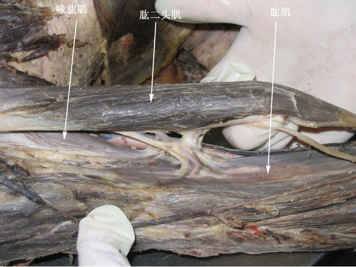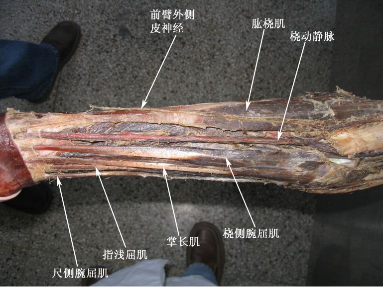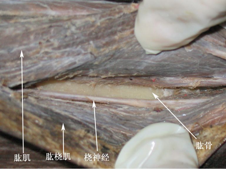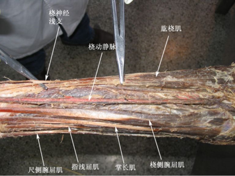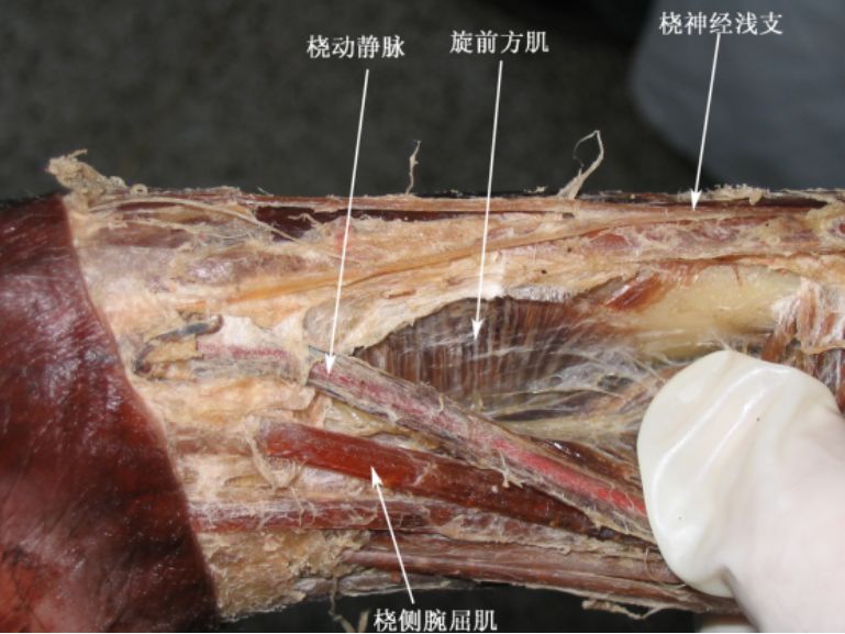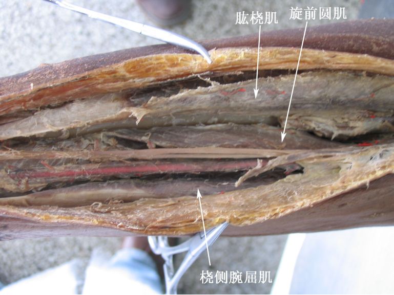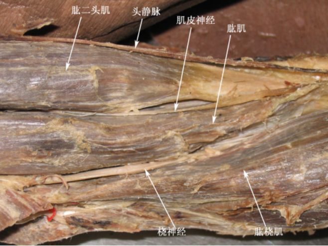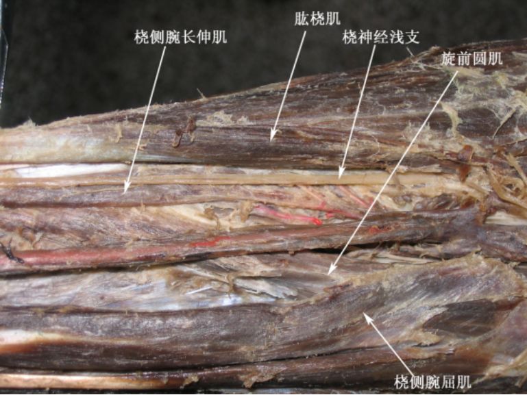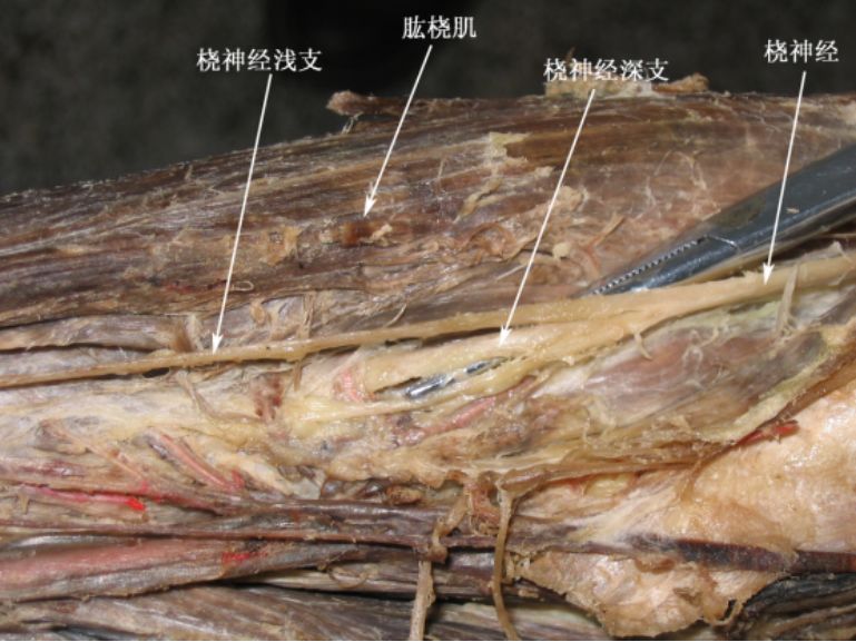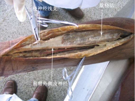 2、神经界面:界面位于肱桡肌和桡侧腕屈肌之间,前者为桡神经支配,后者为正中神经支配。
