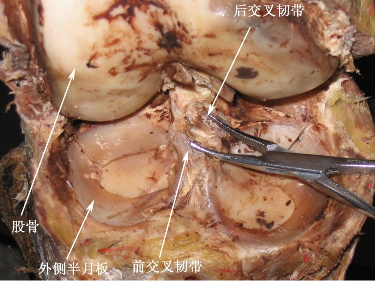 前、后交叉韧带:前交叉韧带起于胫骨髁间隆起前部,止于股骨外侧髁的内侧面上部。 后交叉韧带起于胫骨髁间隆起后部,止于股骨内侧髁的外侧面。