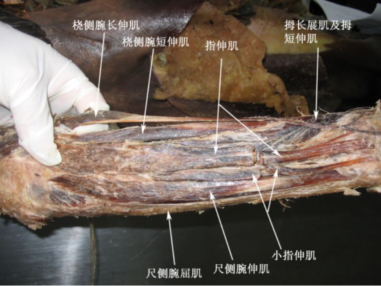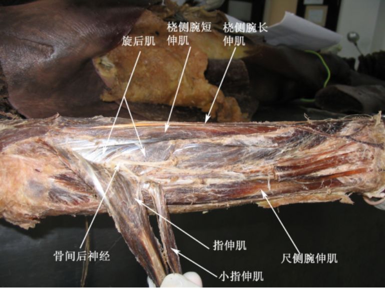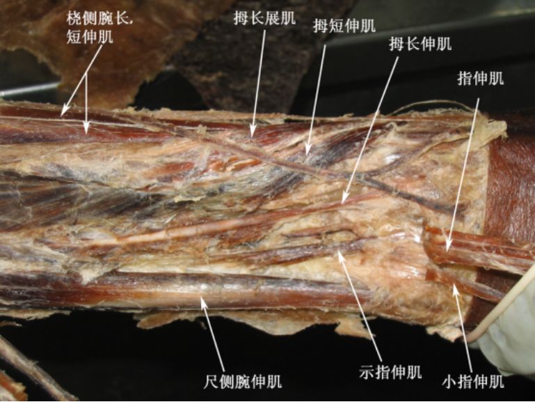 (2)深层:有5块肌,旋后肌位于上外侧部,其余从桡侧向尺侧为:拇长展肌、拇短伸肌、拇长伸肌和示指伸肌。