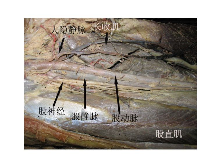 股神经:位于动脉的外侧,立即分成多条肌支和皮支,其中有两条神经一直伴动脉下行,即隐神经及其外侧的股内侧肌支。