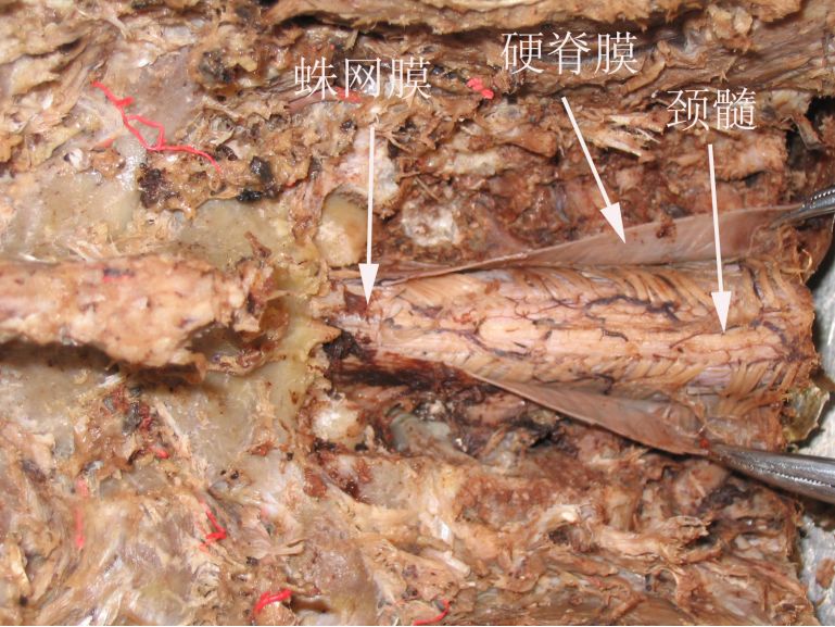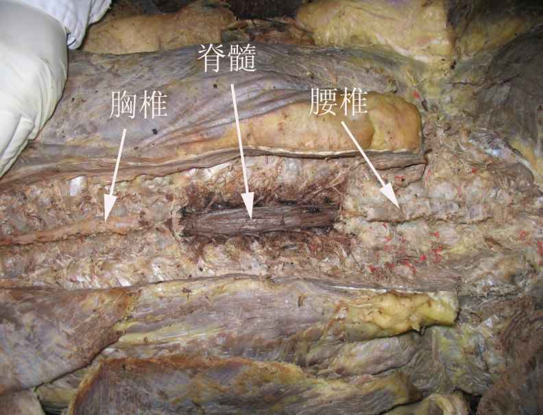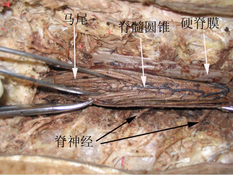 4、脊髓:位于椎管内,呈圆柱形,脊髓的上端在平齐枕骨大孔处与延髓相连,下端平齐第一腰椎下缘,长约40~45cm。脊髓的末端变细,称为脊髓圆柱。自脊髓圆柱向下延为细长的终丝。