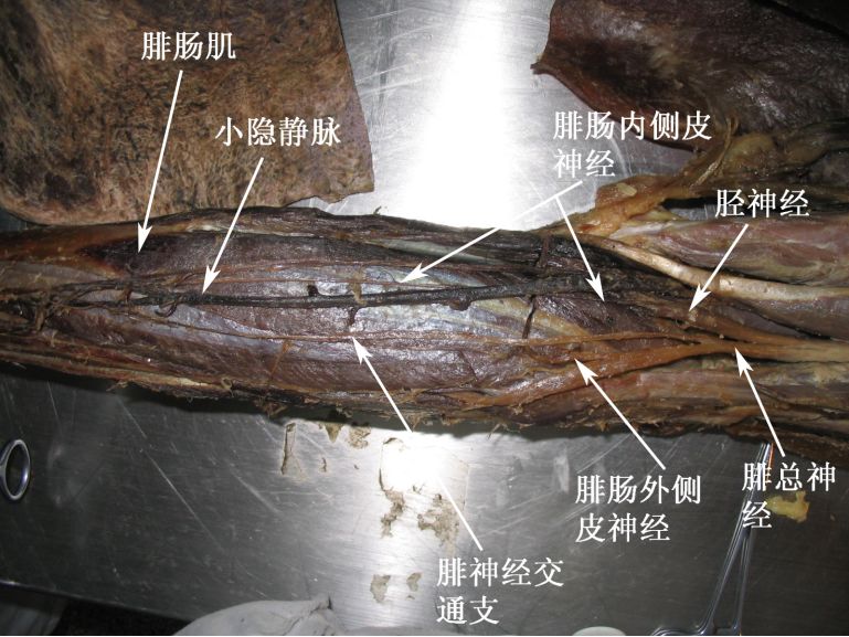 胫后动脉、腓动脉和胫后神经位于小腿后区浅、深两层肌之间。胫后神经于二动脉分叉后越过胫后动脉浅面,并在二条动脉之间下降,三者贴附于骨平面,在胫骨后肌筋膜深面,肌内、外缘及其中间下行。至小腿下端,神经趋向胫侧血管进入踝管,而腓动脉独自进入外踝下方。