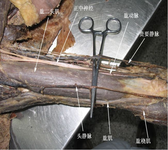 1、皮肤切口:自肘上10cm开始,沿肱二头肌外侧缘向下,到肘屈侧皮肤横纹止。
