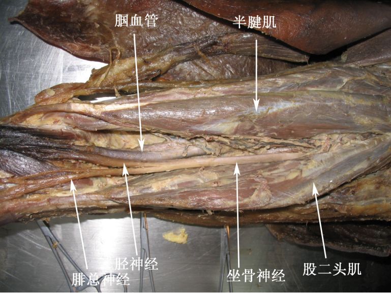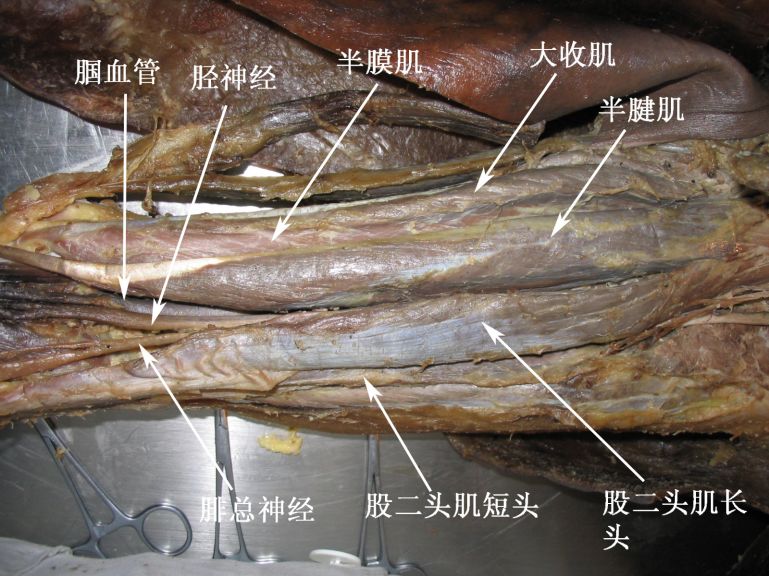 腘窝呈菱形,后壁为腘筋膜;前壁为股骨腘面、关节囊后部、腘斜韧带和腘肌;上内侧壁为半膜肌和半腱肌;上外侧壁为股二头肌;下内侧壁为腓肠肌内侧头;下外侧壁为腓肠肌外侧头。其内容物为胫神经、腘静脉、腘动脉等。