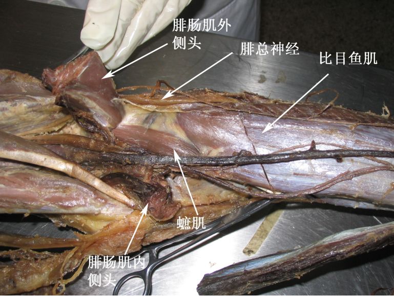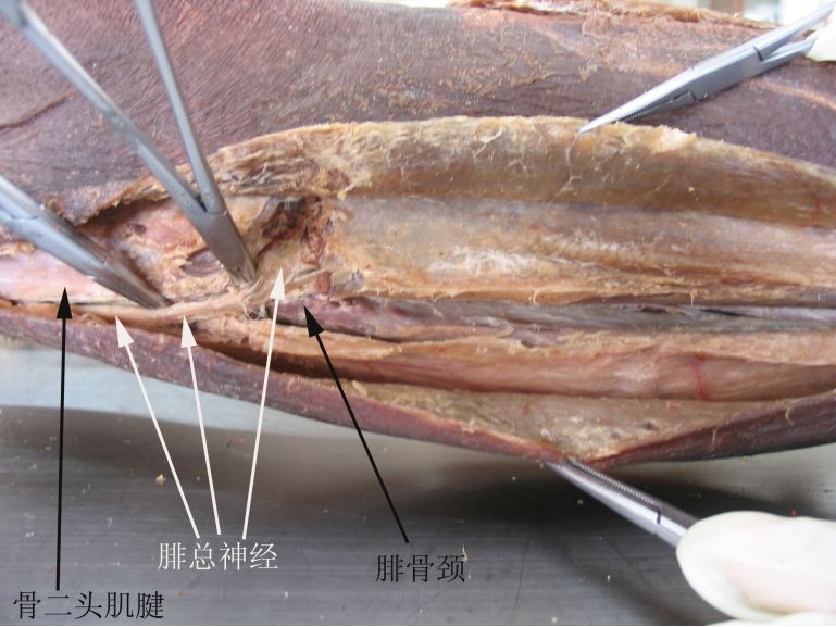 1)开始在近侧与切口线一致切开深筋膜,找出骨二头肌腱的后缘,并在其后方辨认并游离腓总神经,向下追溯至弯绕腓骨颈处。
