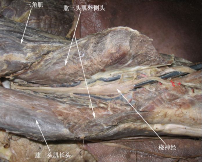 桡神经:在臂上部行于肱动脉后方,然后伴肱深动脉沿桡神经沟走行;绕肱骨中段背侧转向外下方,穿肱骨肌管至臂后区。
